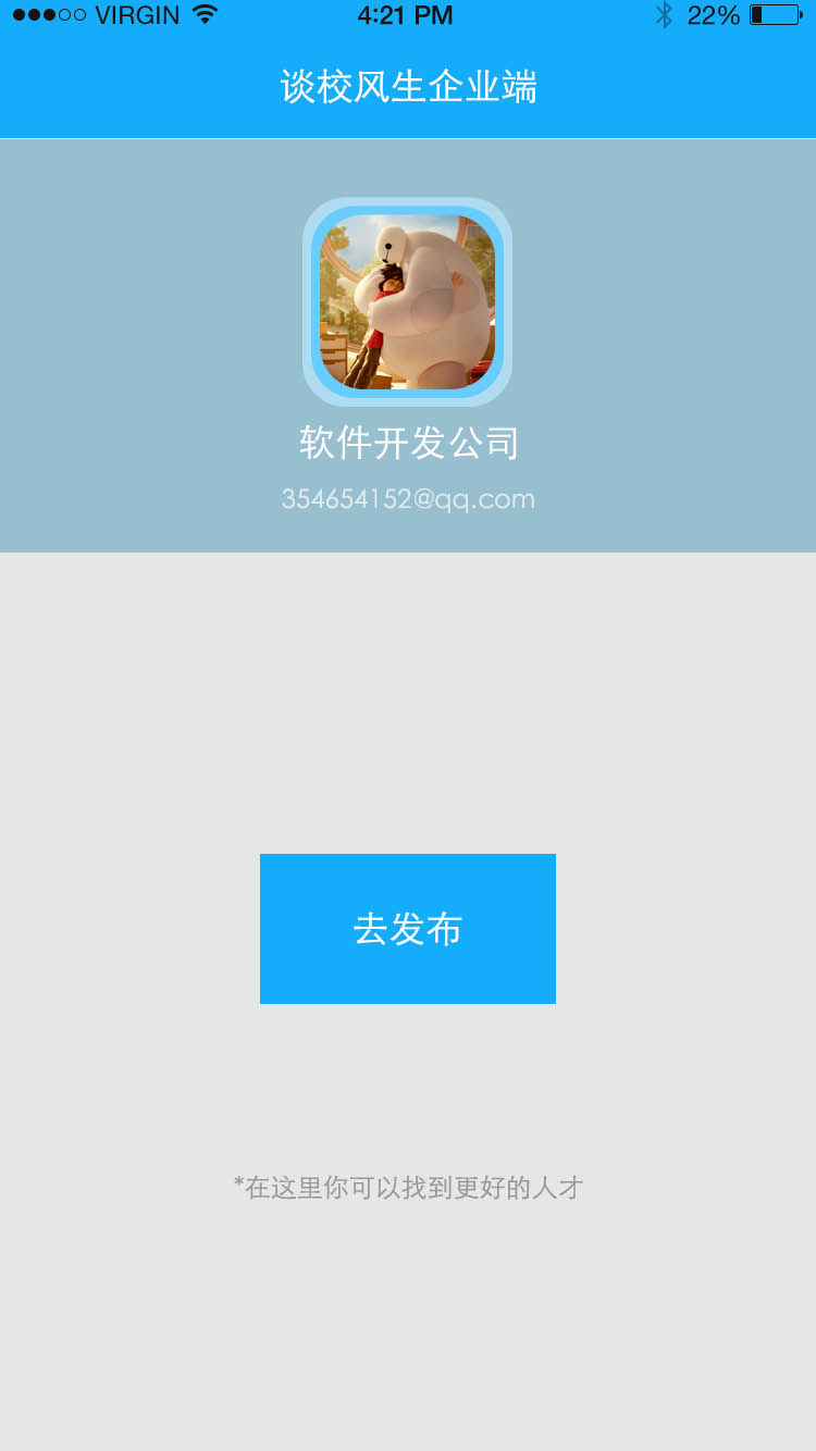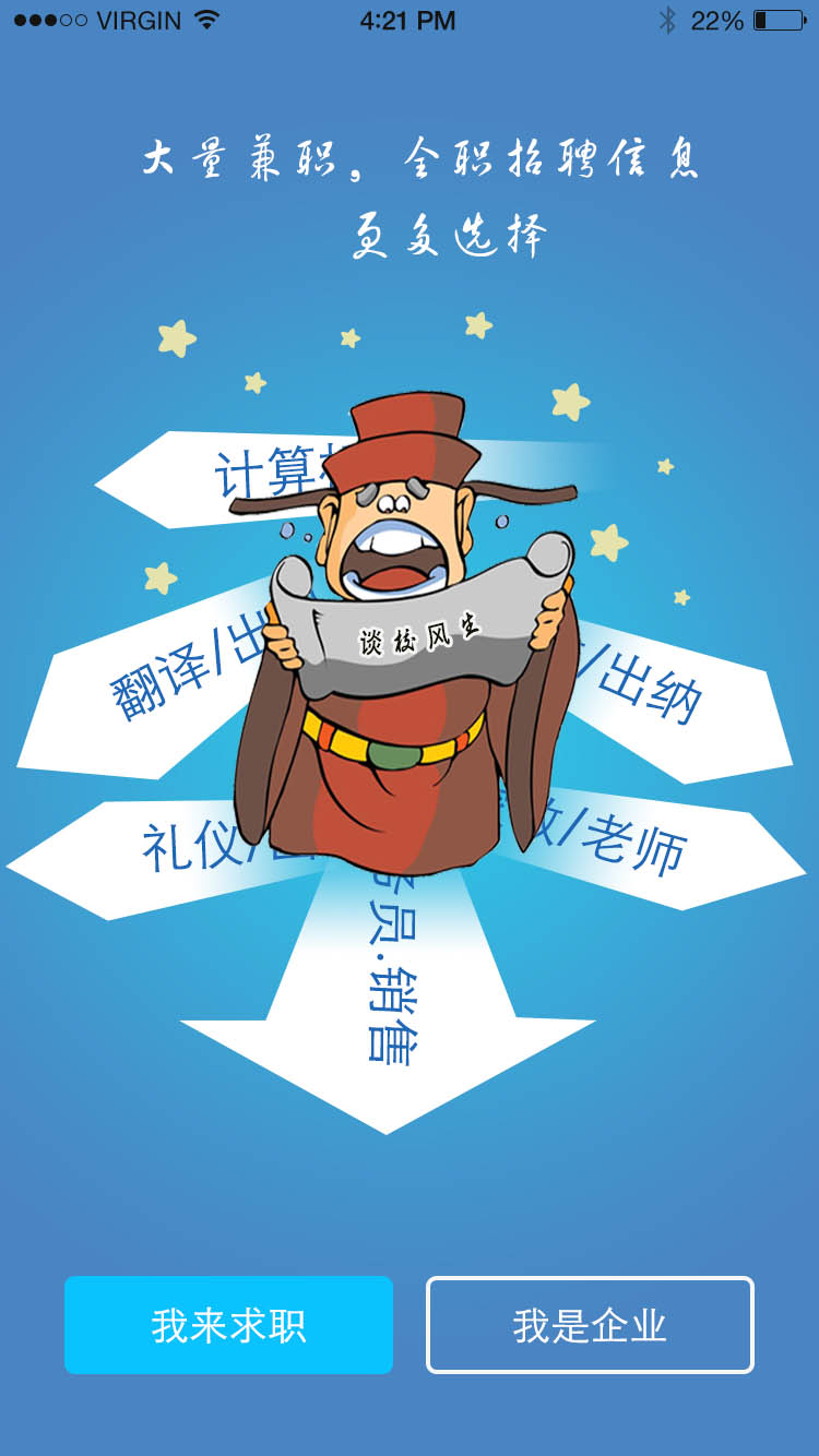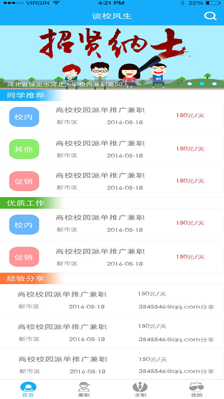 谈校风声校园招聘APP,实现全职或兼职招聘信息的发布与选定、学生简历管理、订单处理、广告处理等功能。意在为学生找工作提供公平公开公正的平台,避免中介公司赚取中间费用。同时平台会保护学生简历信息不会泄漏或被盗。